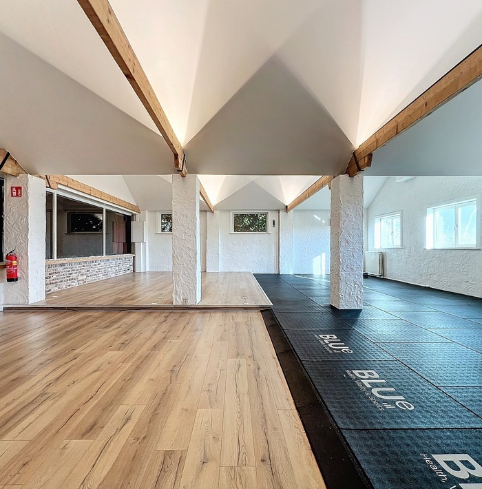 If you walk to the back of the building, a long corridor will lead you to a technical room, a changing room with two separate bathrooms, a toilet group, and two larger spaces that can be arranged according to your own wishes.