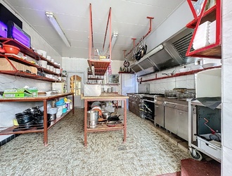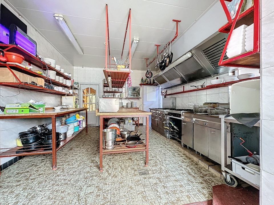 La cuisine professionnelle est entièrement équipée et adaptée à une grande capacité. Il y a également un bar, des sanitaires et des espaces de stockage pratiques.